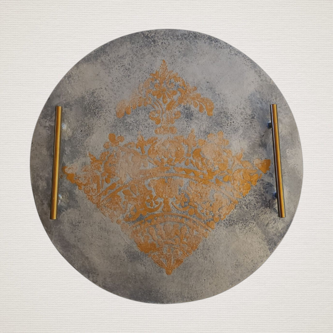 Χειροποίητος γύψινος δίσκος γκρι με ασημί-χρυσά νερά, χρυσό ματ μοτίβο και μεταλλικά χρυσά χερούλια. Δ50εκΥ3εκ. ΔΙΑΘΕΣΙΜΟ ΚΑΤΑ ΠΑΡΑΓΓΕΛΙΑ *όλα μας τα προϊόντα είναι 100% χειροποίητα, μοναδικά κομμάτια! Σας ενημερώνουμε ότι τα προϊόντα που είναι παραγγελία, ενδέχεται να έχουν διαφορές στο σχήμα και το χρώμα.