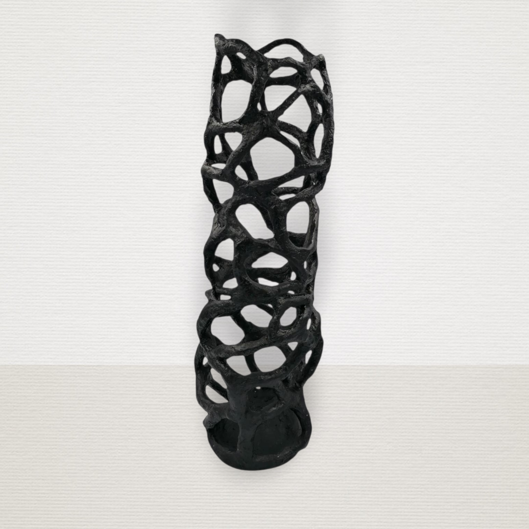 Χειροποίητο βάζο μαύρο με αφηρημένο σχήμα και ιδιαίτερη σπατουλαριστή τεχνοτροπία. Υ52εκ Δ13εκ.