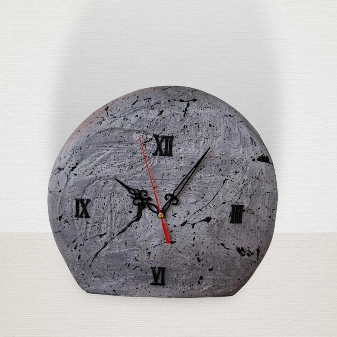 Χειροποίητο γύψινο επιτραπέζιο ρολόι γκρι με μαύρες πιτσιλιές. Π29εκΥ27εκ.
