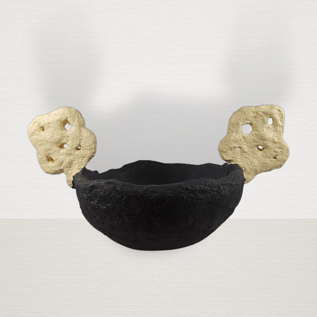Χειροποίητο γύψινο μπολ-φρουτιέρα ανθρακί με χερούλια ώχρα ανοιχτή. Δμπολ30εκ Υμπολ15εκ, Δμε χερούλια46εκ Υμε χερούλια25εκ.