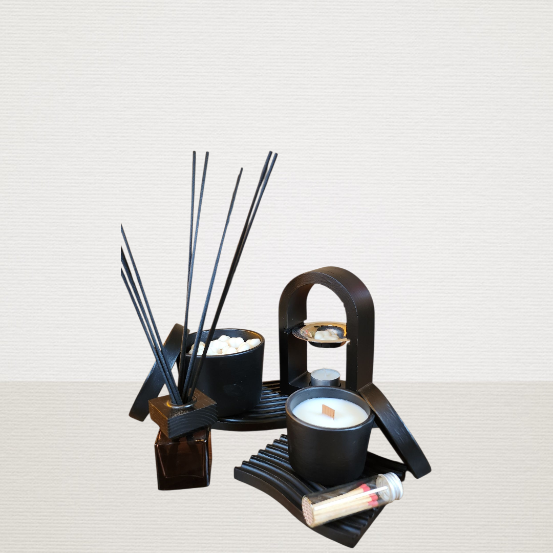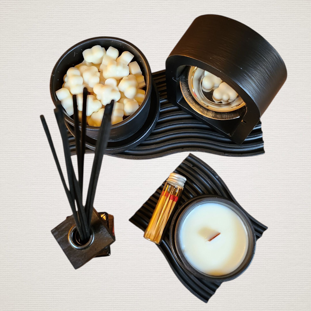 Σύνθεση από μαύρα γύψινα διακοσμητικά που αποτελείται: από έναν δίσκο κυματιστό Μ25Π12Υ1εκ, έναν καυστήρα οβάλ Υ16Π11Πάχος5εκ, wax melts 200γρ. συννεφάκια λευκάΔ12εκ, ένα κερί σόγιας με ξύλινο φυτίλι σε βάζο με καπάκι Υ6,5Δ9εκ και ένα αρωματικό χώρου σε βάζο καφέ-μαύρο Υ7,5Δ5,5εκ. με μαύρα ξυλάκια μπαμπού 30εκ. Όλα εμπλουτισμένα με άρωμα σοκολάτα-φουντούκι. ΔΙΑΘΕΣΙΜΟ ΚΑΤΑ ΠΑΡΑΓΓΕΛΙΑ σε ό,τι χρώμα επιθυμείτε. *όλα μας τα προϊόντα είναι 100% χειροποίητα, μοναδικά κομμάτια! Σας ενημερώνουμε ότι τα προϊόντα που είναι κατά παραγγελία, ενδέχεται να έχουν κάποιες διαφορές στο σχήμα και το χρώμα.
