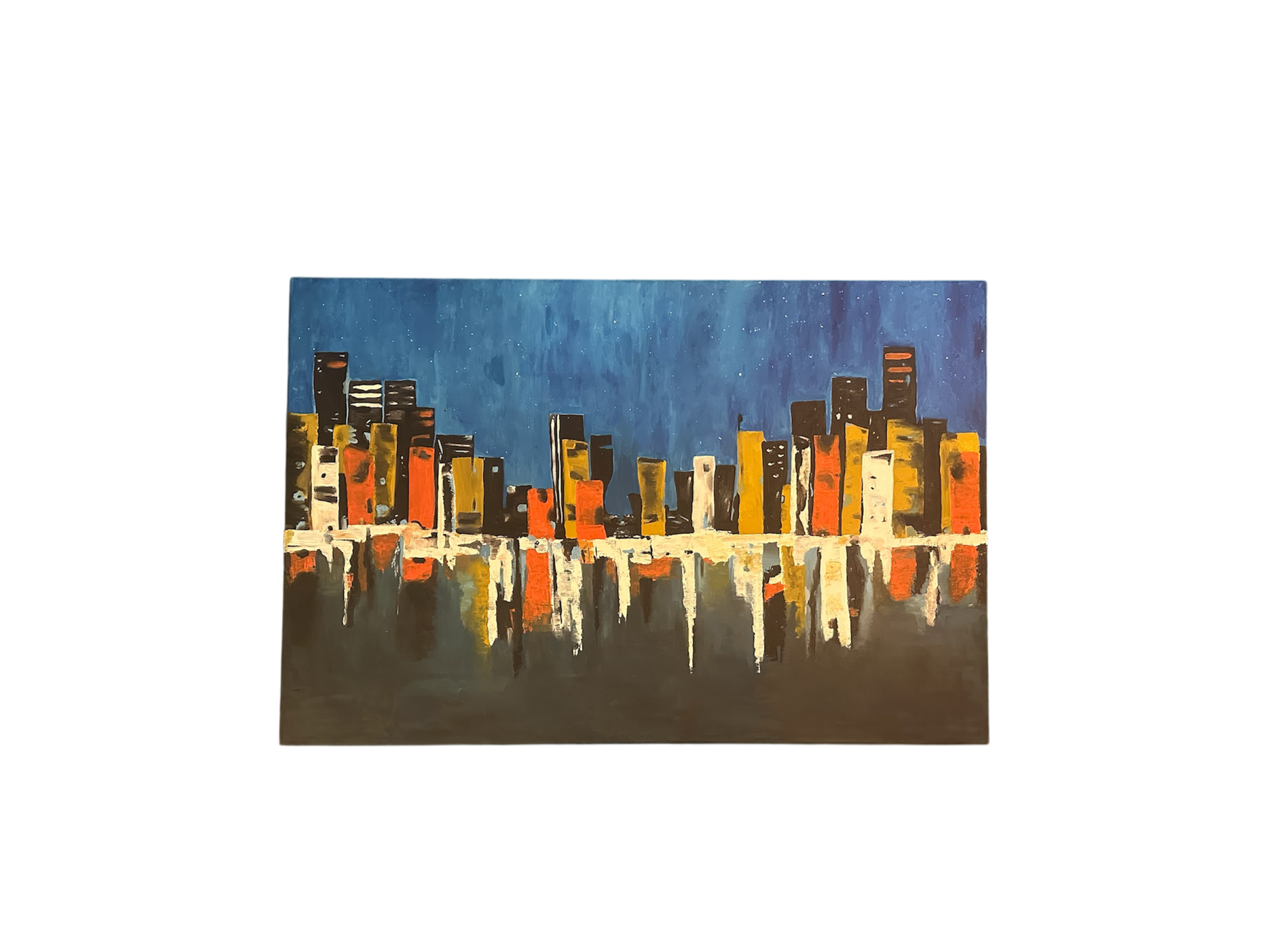 Πίνακας σε καμβά.120X80εκ. Μία δημιουργία με έντονες, κάθετες πινελιές που διαμορφώνουν την αίσθηση μιας πολύχρωμης αστικής ουρανογραμμής. Οι μπλε αποχρώσεις στο φόντο και στην αντανάκλαση παραπέμπουν στη νύχτα, ενώ τα θερμά χρώματα των κτιρίων δημιουργούν έντονη αντίθεση και ζωντάνια. 120X80εκ. ΔΙΑΘΕΣΙΜΟ ΚΑΤΑ ΠΑΡΑΓΓΕΛΙΑ *όλα μας τα προϊόντα είναι 100% χειροποίητα, μοναδικά κομμάτια! Σας ενημερώνουμε ότι τα προϊόντα που είναι κατά παραγγελία, ενδέχεται να έχουν κάποιες διαφορές στο σχήμα και το χρώμα.